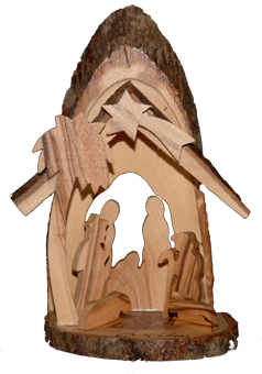 En vackra julkrubban är specialtillverkad för Karavanen och gjord helt i olivträ av skickliga palestinska kristna olivträhantverkare i en liten familjeverkstad.